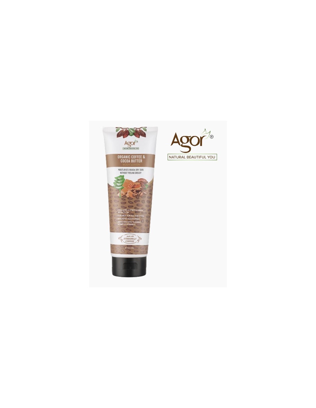 Agor Organic Coffee & Cocoa Butter Body Lotion is a moisture-rich formulation designed to relieve dry skin by absorbing quickly to create a protective barrier that locks in moisture, keeping the skin hydrated for longer.