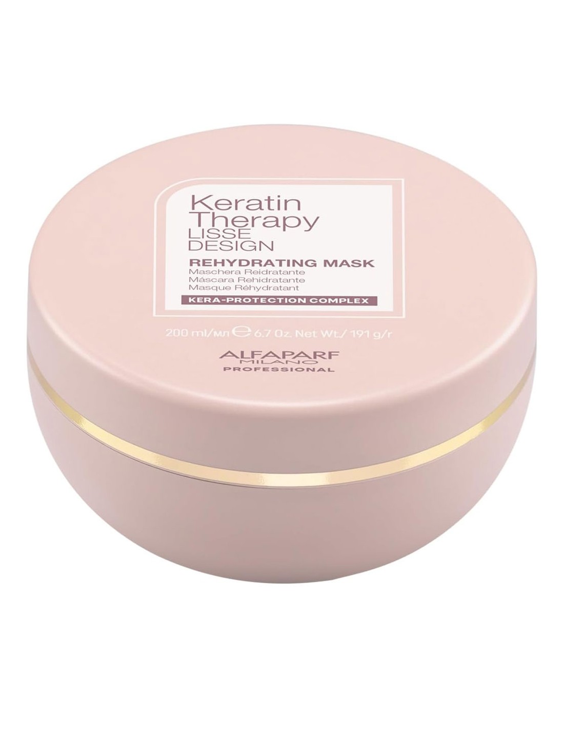 The Keratin Therapy Lisse Design Rehydrating Mask by Alfaparf Milano Professional provides intensive moisture and protects the hair from drying out.