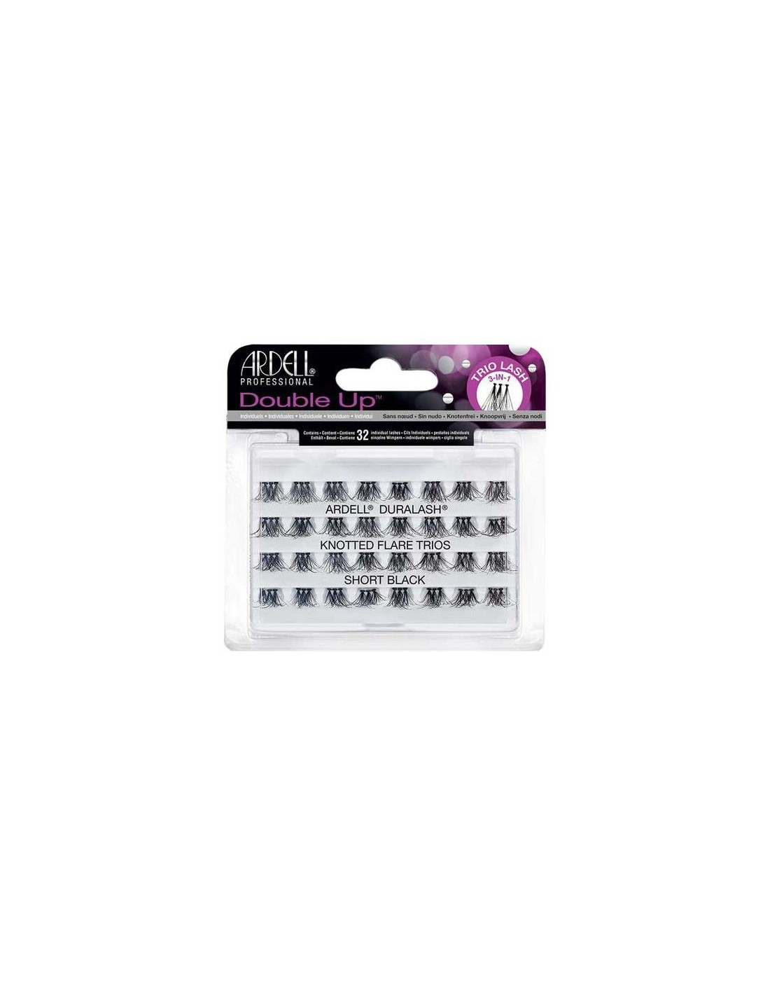 Ardell Double Up 3 In 1 Knotted Lash Short. For a quick, easy and professional-looking lash enhancement use the Ardell Duralash Double Up Knotted Flare Trios in short. These doubled-up trio clusters have been designed to provide a dimensional effect, adding instant length and customised fullness for a seamless blend and flawless finish.