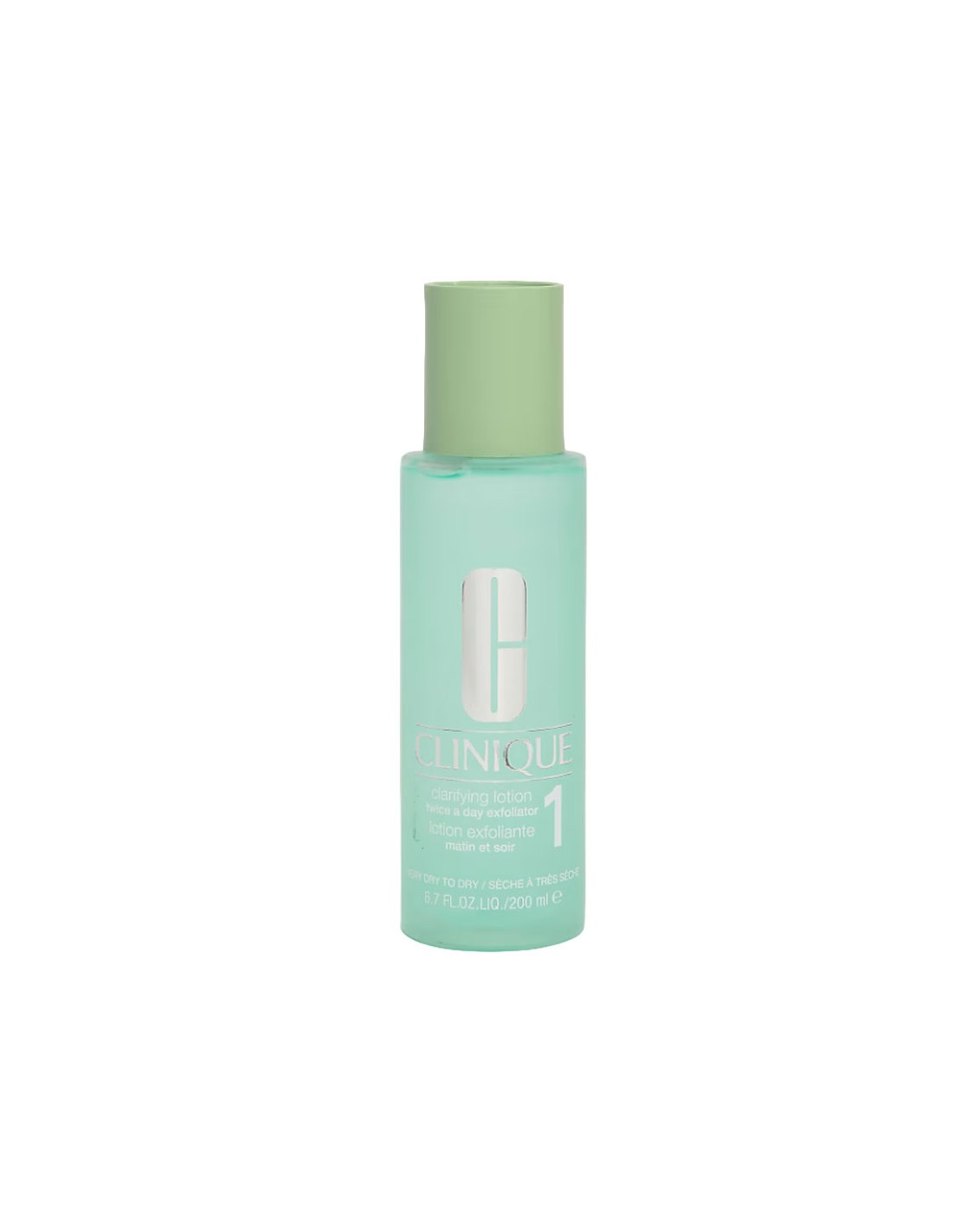 Clinique Clarifying Lotion 1 Very Dry to Dry Skin sweeps away dead surface skin cells on very oily skin. Helps clear away pollution, dulling flakes for smooth, glowing skin. Helps pores look their smallest. Skin accepts moisture better. Grows more resistant to impurities. Stays healthier, younger. Dermatologist-reformulated to be comfortable, non-drying