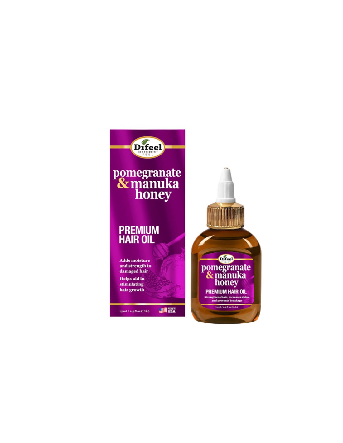 Difeel Pomegranate & Manuka Honey Premium Hair Oil is a nourishing and revitalizing hair treatment designed to improve the health and appearance of your hair. Combining the powerful benefits of pomegranate and manuka honey, this hair oil is formulated to hydrate, strengthen, and protect your hair, leaving it soft, shiny, and manageable. Strengthens & Moisturizes Introducing Difeel Pomegranate & Manuka Honey Hair Oil, expertly crafted to replenish and revitalize your hair with the natural goodness of pomegranate and manuka honey. Formulated to add moisture, strengthen strands, and stimulate hair growth, this potent blend is a must-have addition to your hair care routine.Ideal for Dry, Brittle Hair Infused with the hydrating properties of pomegranate and the fortifying benefits of manuka honey, our hair oil deeply penetrates each strand, restoring moisture and vitality from root to tip. Say goodbye to dry, brittle hair as our rich formula works to replenish lost hydration, leaving your locks feeling irresistibly soft and supple.