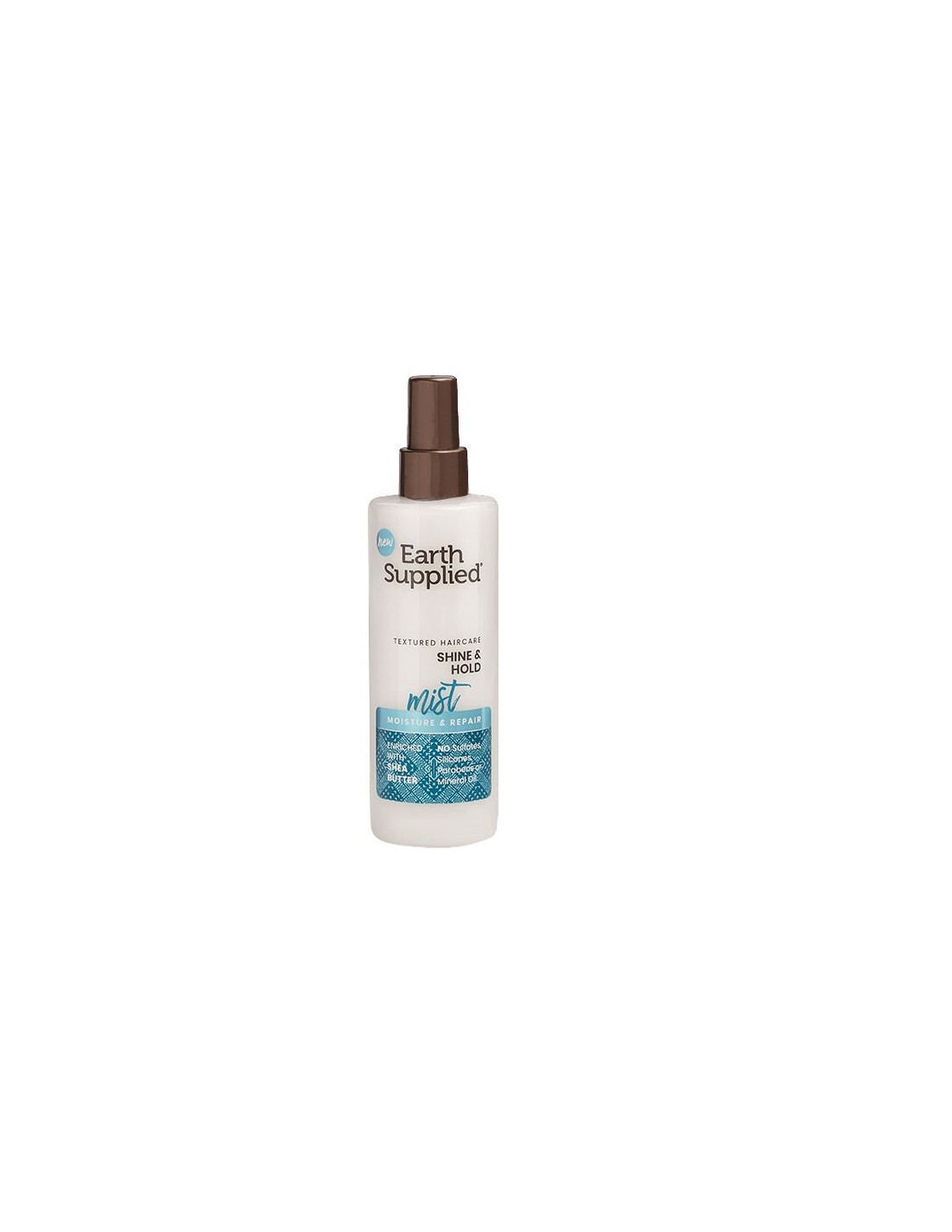 Earth Supplied Moisture & Repair Shine & Hold Mist is made with African Shea Butter + Southeast Asian Coconut Oil to replenish moisture, detangle, soften, and repair coily and curly hair.