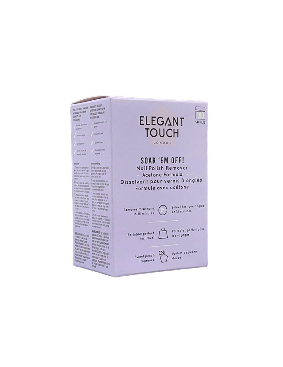 Elegant Touch Soak 'Em Off Nail Polish Remover is a specially formulated solution designed to make the process of removing stubborn or long-lasting nail polishes, including gel and acrylics, easy and effective. This remover ensures a gentle yet thorough experience, preserving the health of your natural nails. Elegant Touch Soak Em Off Acetone Sachets make removing artificial nails easy and mess-free. The pre-soaked sachets are convenient and effective. Perfect for quick and hassle-free nail removal.