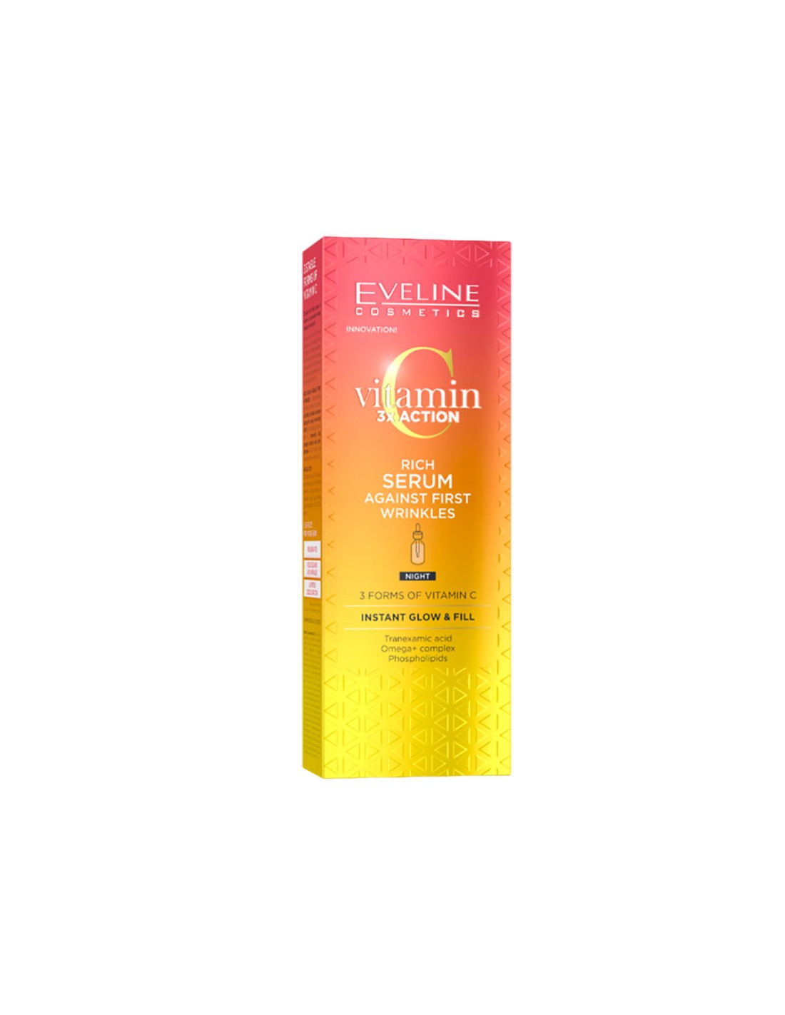 Eveline Vitamin C 3X Rich Night Serum Against First Wrinkles is a specialized night serum formulated to combat the first signs of aging, including fine lines and wrinkles. Enriched with Vitamin C, this serum works overnight to rejuvenate the skin, providing intense hydration, brightening, and antioxidant protection. The rich formula is designed to target early signs of aging while improving skin texture and radiance, ensuring you wake up to refreshed, youthful skin with a combination of multiple active ingredients, the serum works quickly to reduce the appearance of lines and wrinkles while rejuvenating your skin. The unique composition with three forms of vitamin C, tranexamic acid, omega acid and phospholipids effectively strengthens and regenerates the skin, ensuring its healthier appearance and intensive hydration.