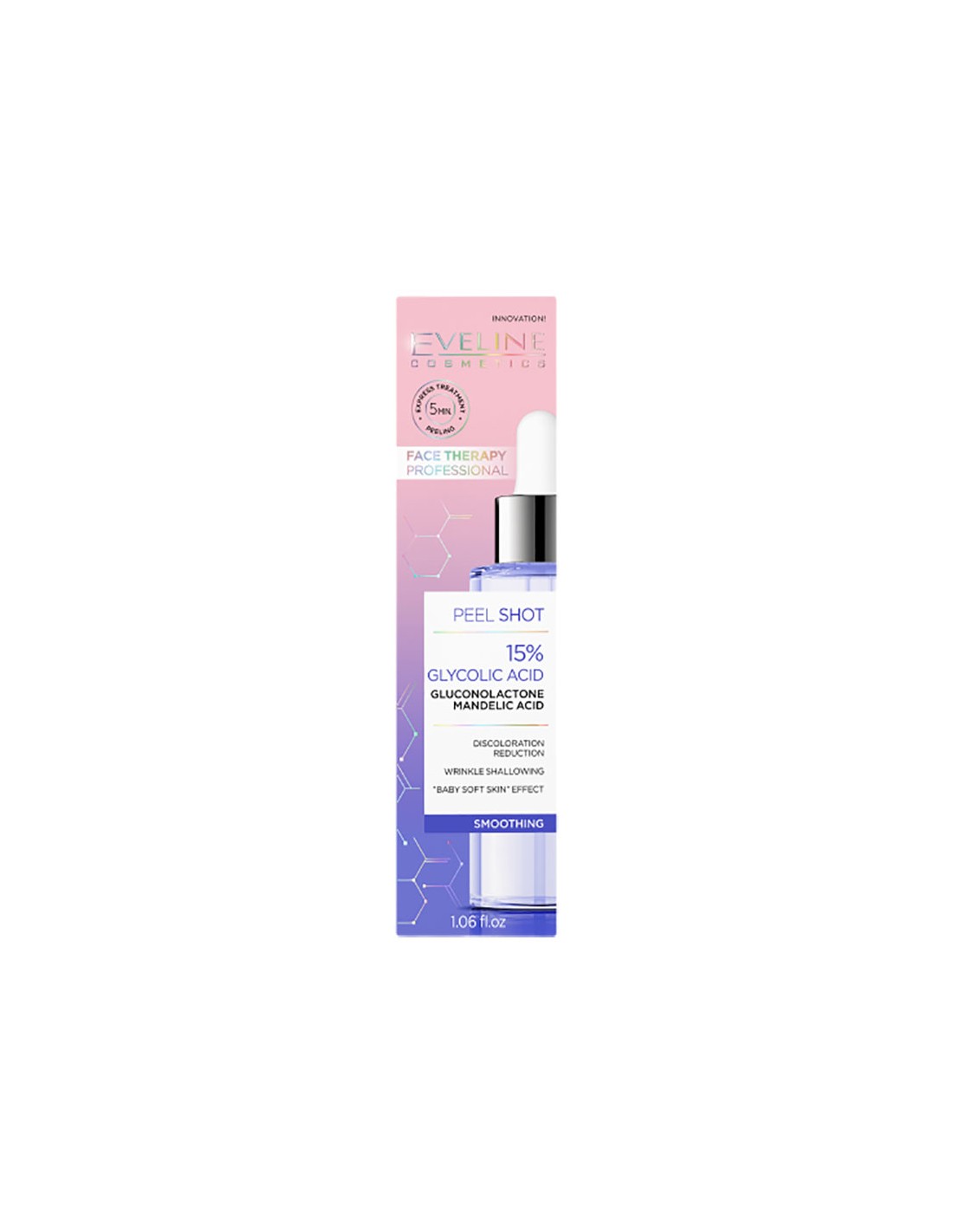 Eveline Face Therapy Glycolic Acid Peel Shot Serum is a potent treatment designed to exfoliate, smooth, and brighten the skin. It features 15% AHA glycolic acid as the key ingredient, targeting discoloration, fine lines, and uneven skin texture.