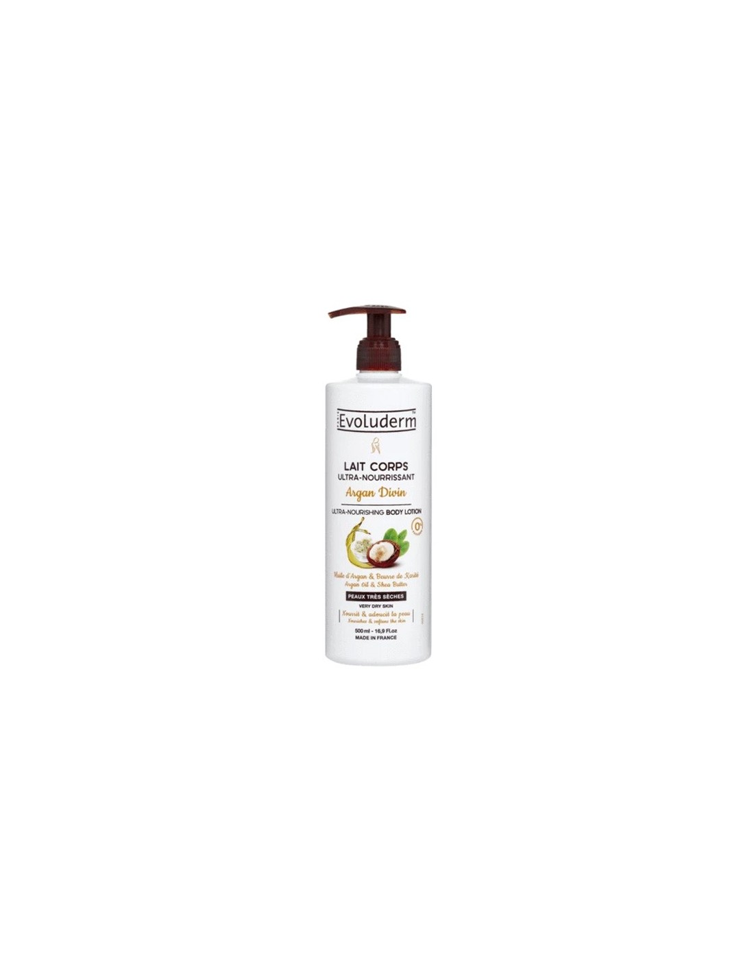 Evoluderm Argan Divin Ultra Nourishing Body Lotion is a deeply moisturizing body lotion formulated to hydrate and restore the skin's natural softness and suppleness. Enriched with the nourishing benefits of argan oil, this luxurious lotion provides intense hydration to dry and sensitive skin, leaving it feeling smooth, silky, and rejuvenated.Specially formulated to take care of very dry skin, the Ultra-Nourishing Body Lotion Argan Divine combines two ingredients known for their nutritional properties. Argan oil, a treasure from Moroccan argan trees, moisturizes and comforts damaged skin, and Burkina Faso Shea Butter repairs and cares for skin that needs comfort. Ancestral beauty secrets, these natural ingredients help fight dry skin by acting as shields against external aggression.