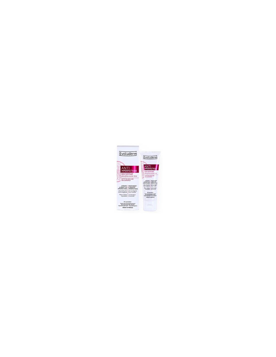 Evoluderm Anti Imperfections Mattifying Skin Care with Pink Grapefruit is a specialized skincare product designed to control excess oil, reduce blemishes, and provide a matte finish. Ideal for oily and acne-prone skin, this moisturizer works to keep your skin hydrated while targeting imperfections.93% natural and vegan, this treatment helps to control and reduce imperfections in combination to oily skin. A perfect step to help imperfection-prone skin to recover a smooth, matte appearance. The formula combines the cleansing properties of Pink Grapefruit extract, which intensely purifies the skin, and the astringent properties of Zinc.