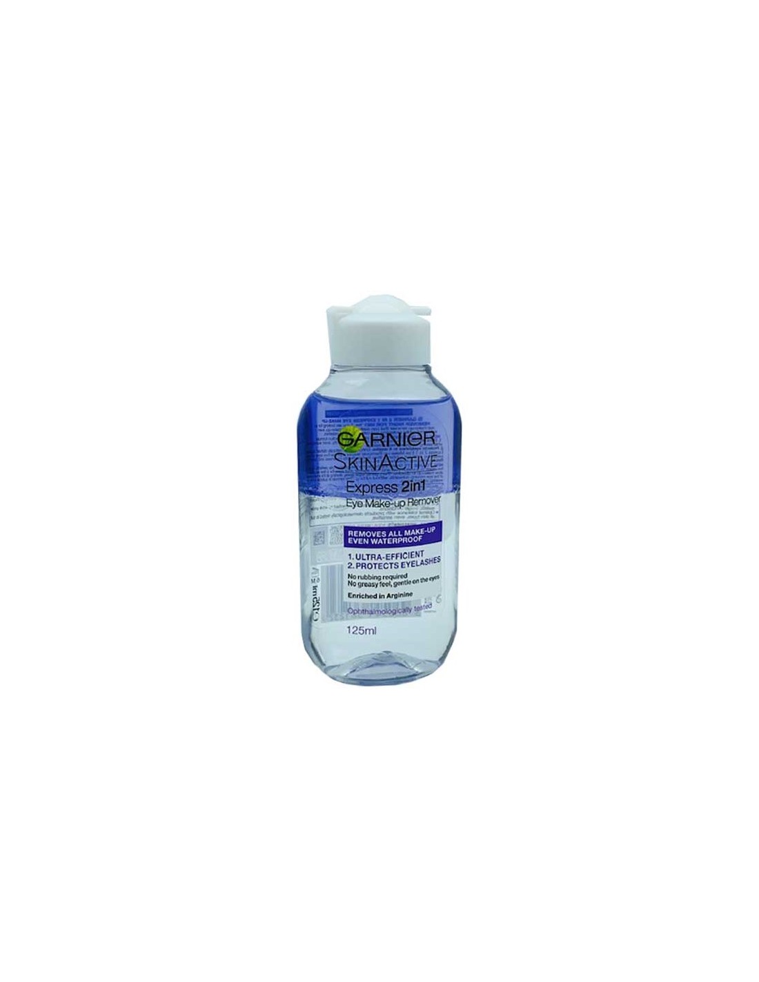 Skin Active Express 2 In 1 Eye Make Up Remover. Leave yourself with a smooth, cleansed base before you go to sleep, with the Garnier Skin Naturals 2-in-1 Eye Make-Up Remover. The formula gently lifts away even waterproof make-up, without rubbing, over-drying the skin or leaving any uncomfortable tightness. The remover is fortified with naturally-derived arginine, to protect and care for your lashes and delicate eye area, minimising the risks of irritation or redness.