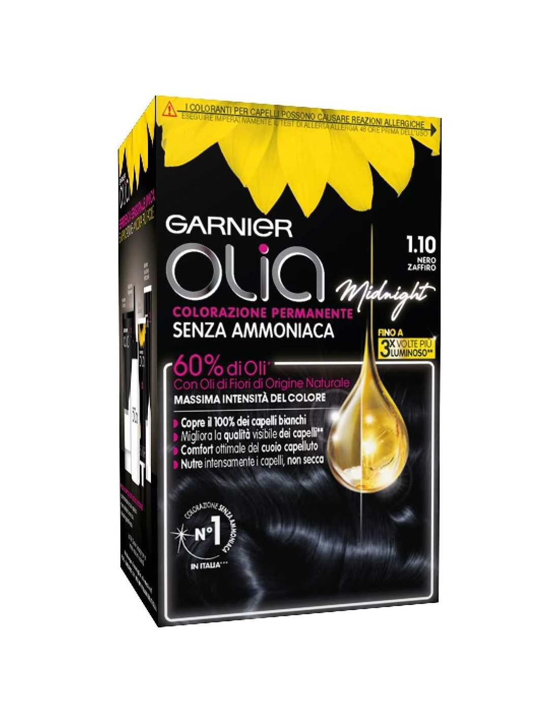 Olia Midnight Permanent No Ammonia Hair Dye. Our 60% oil powered formula, with natural flower oils and no ammonia, visibly improves hair quality for up to 3x shinier hair and optimal scalp comfort.
