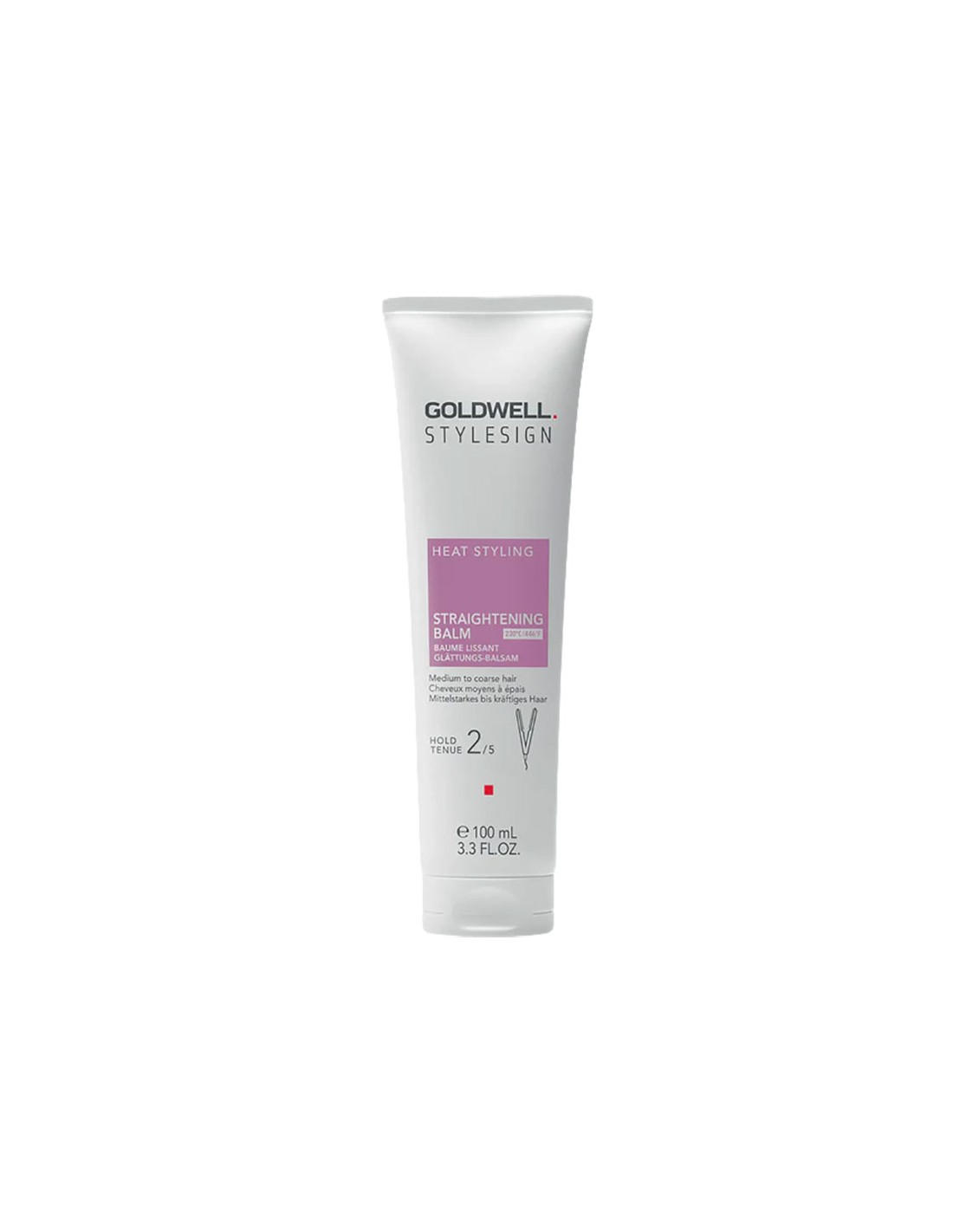 Goldwell StyleSign Heat Styling Straightening Balm effectively straightens hair for 72 hours, even damaged or coarse hair, while shielding against frizz, humidity, and heat damage of up to 230°C / 446°F.