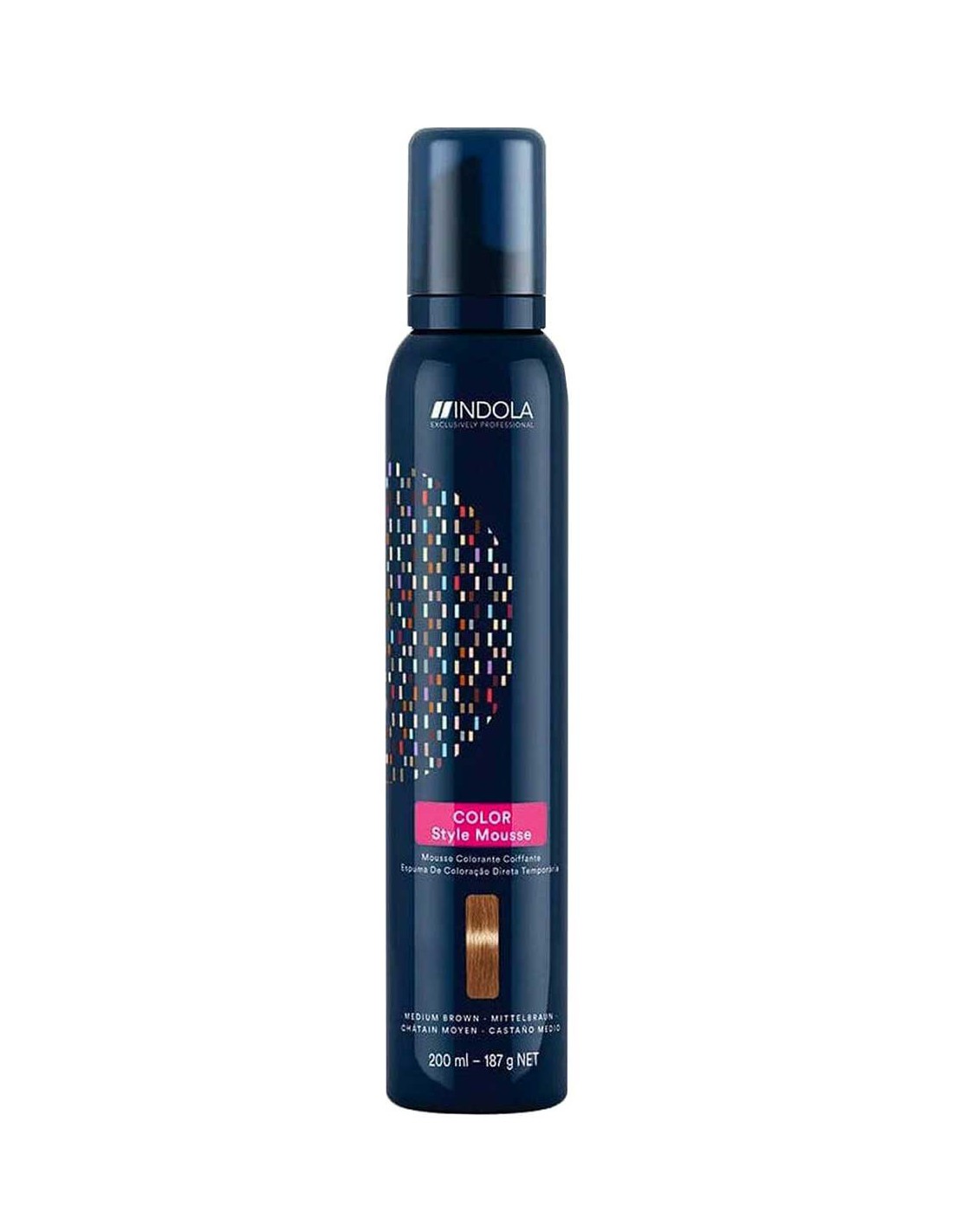 Indola Colour Style Mousse Medium Brown (200ml) is a temporary leave-in hair colour with a natural styling hold factor. Equally effective for colour refreshment, toning, pre-pigmentation and neutralising unwanted tones, the mousse offers protection from thermal styling damage. Enriching and intensifying natural hair colour, it masks early signs of greyness and has a conditioning effect.