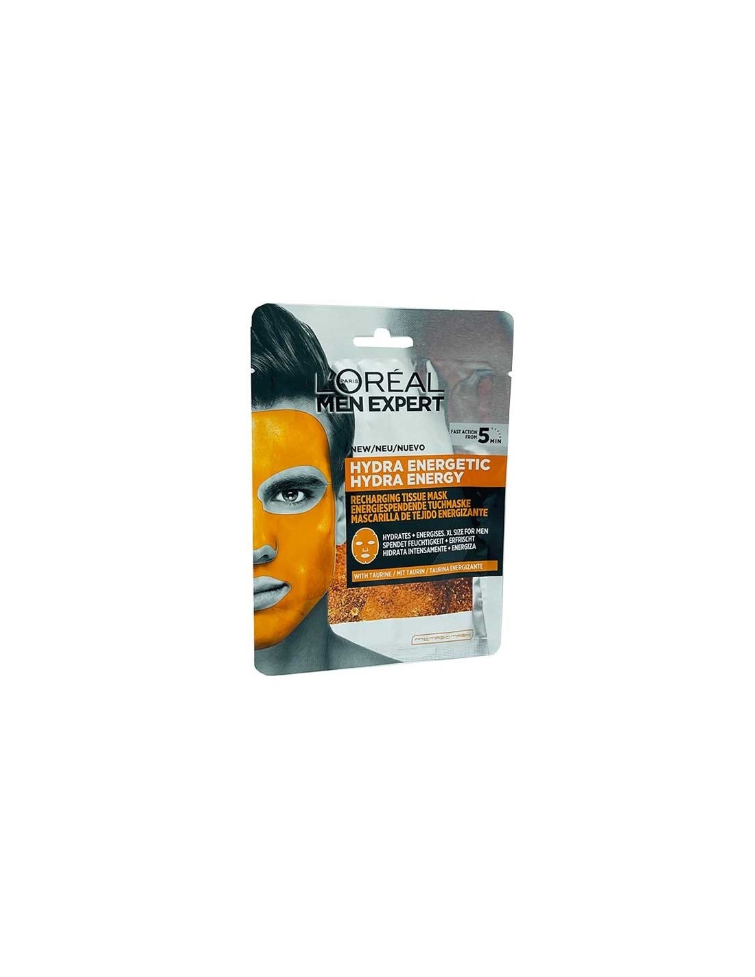 A recharging tissue mask for men Enriched with Taurine to hydrate and fight excess oil XL size for men. From the Hydra Energetic range, discover this recharging orange tissue mask for men to energise the skin.It is designed to hydrate and fight excess oil on the skin, with fast action from 5 minutes. Skin is left rechared with moisture.