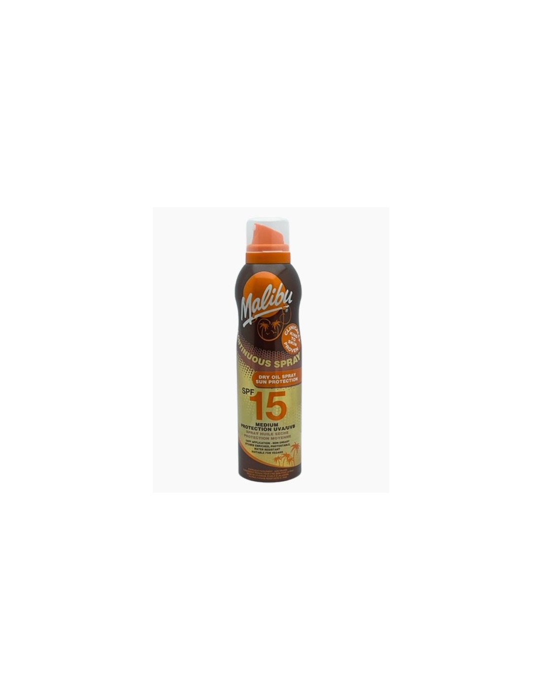 Malibu Continuous Spray Dry Oil Spray Medium Sun Protection SPF15 for skin that tans quite easily and doesn't burn.The higher the SPF (Sun Protection Factor), the more the protection against sun induced damage.
