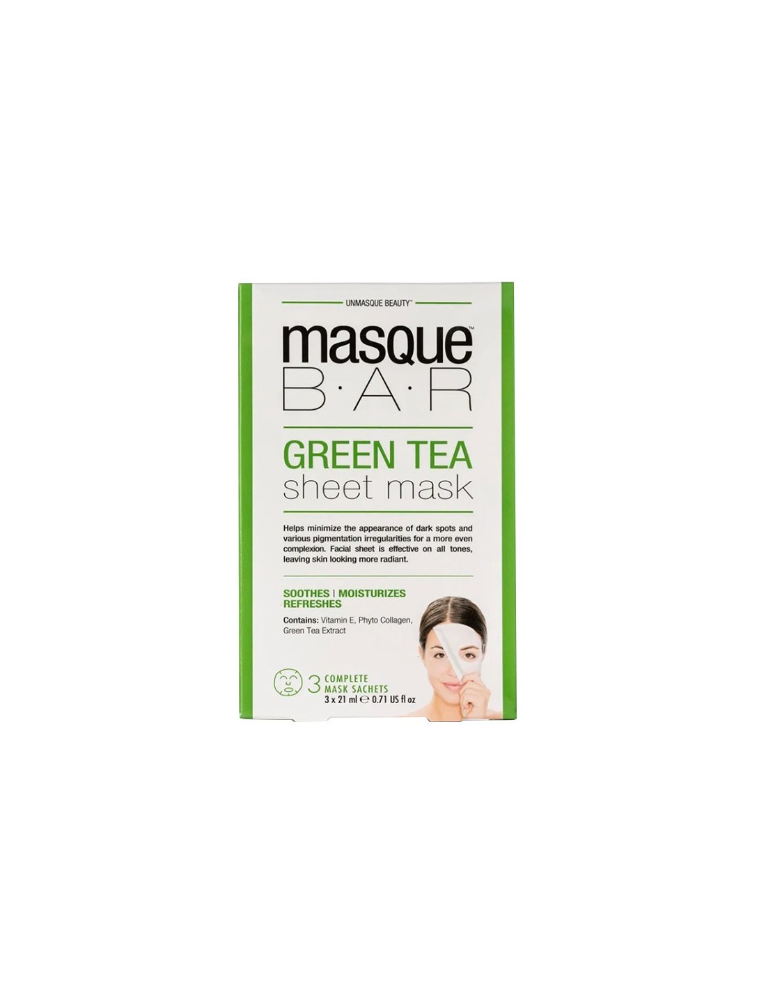 Masque Bar Green Tea Sheet Mask helps minimize the appearance of dark spots and various pigmentation irregularities for a more even complexion.Facial sheet is effective on all tones, leaving skin looking more radiant.