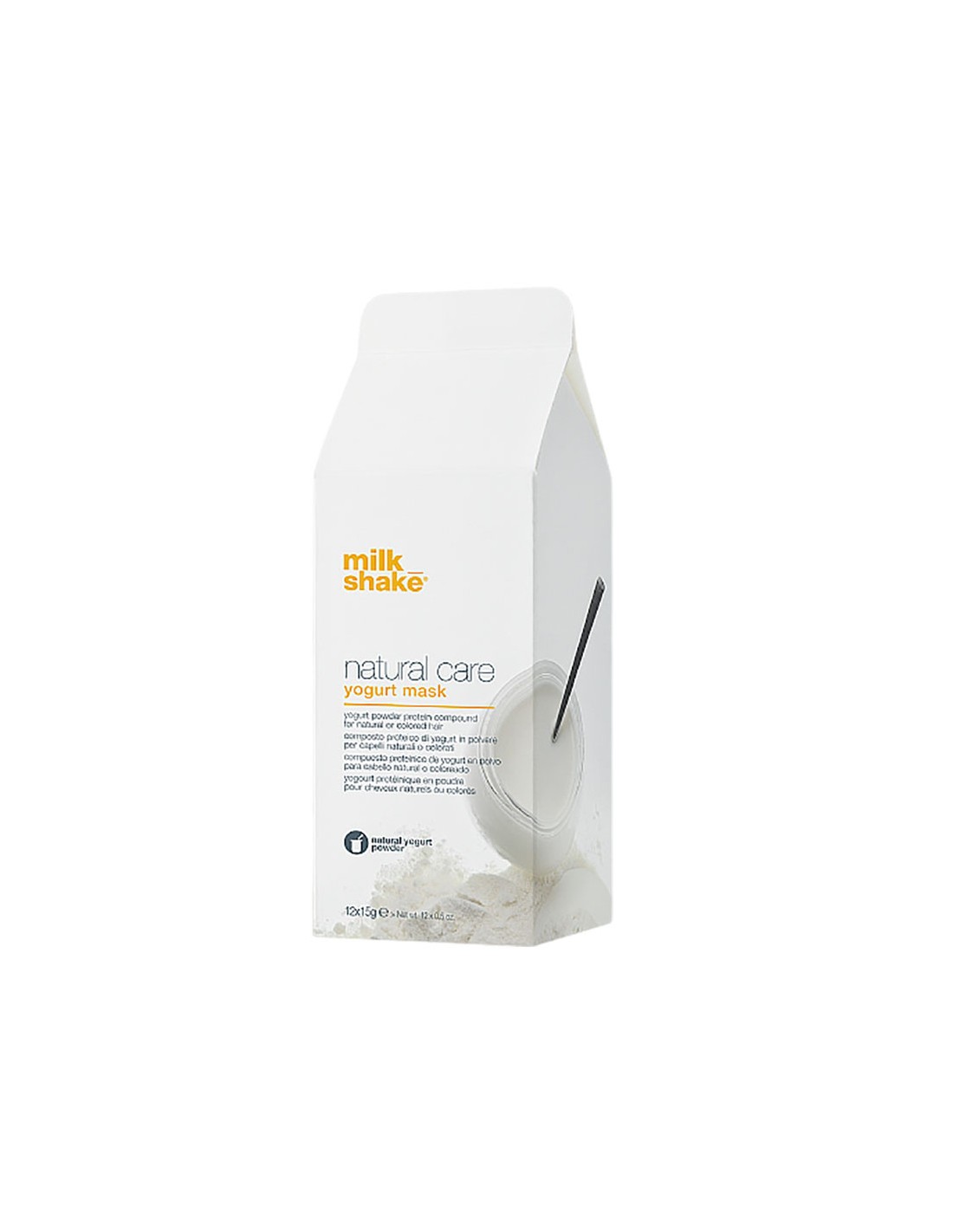 Natural Care Yogurt Mask,milk shake natural yogurt mask treatment is specific for normal or colored hair. The yogurt powder protein compound becomes active once mixed with the milk shake natural care mask base, creating a soft nourishing cream with a pleasant milk shake fragrance. It acts on the inner and outer structure of the hair, restructuring the hair and giving it vibrancy and vitality. The acidity created by yogurt enzymes has a strong conditioning action of the hair. The yogurt amino acids bind to the hair’s structure, giving strength and body.