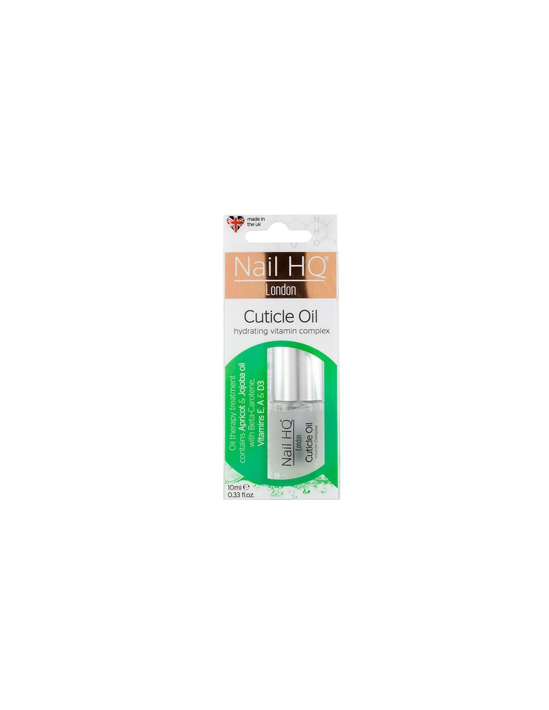Add both to bagNail HQ Cuticle Oil is designed to help moisturise your nails.Conditions the nail bed and cuticle area.Non greasy formulation rejuvenates and softens deteriorated, dry, lifeless cuticles.Contains Jojoba Oil, Apricot Kernel Oil and Beta Carotene as well as Vitamins E, A, and D3.Helps prevent cracking and peeling.
