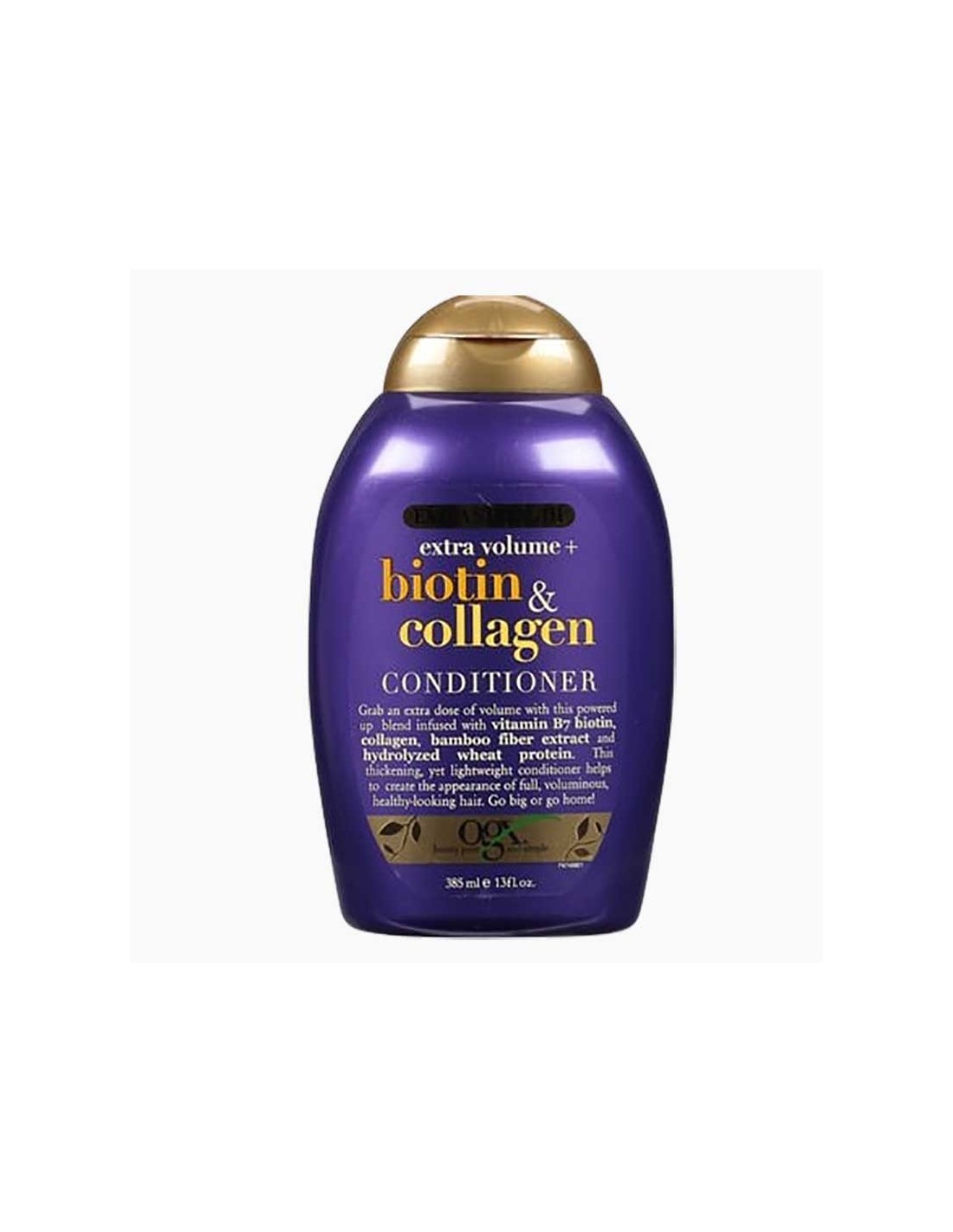 Ogx Extra Volume Biotin Collagen Conditioner is a volumizing conditioner designed to add fullness, thickness, and hydration to fine, flat, or limp hair. Enriched with biotin, collagen, and wheat protein, this conditioner aims to nourish each strand, providing a thicker, more voluminous look. This conditioner is formulated to give thin or flat hair a boost of volume while providing essential nutrients for healthy hair. It is ideal for individuals looking to enhance fullness and body in their hair. Biotin (Vitamin B7) helps support hair strength, while collagen provides structure to each strand, both working together to create a fuller appearance.