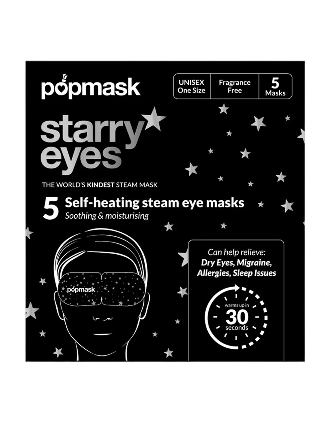 Popmask Starry Eyes Self-Warming Eye Masks (Pack of 5) are innovative masks which deliver soothing warmth and comfort wherever you are, relieving migraines, tension headaches, dry eyes and sleep-related stress. They naturally relax your senses to help you fall asleep faster and wake up feeling refreshed. Each mask is individually wrapped in a convenient 5-pack, making them ideal for use at home or on the go. No creams or lotions are needed, just pure, gentle warmth for a soothing experience. Cruelty-free & vegan-friendly.