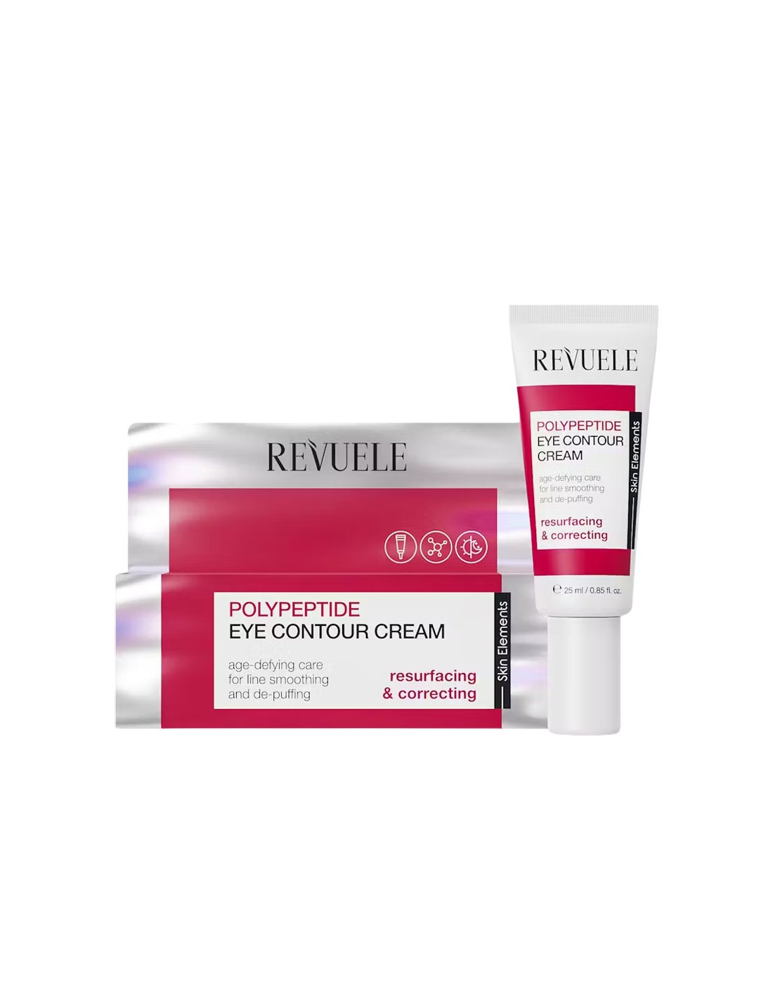 REVUELE POLYPEPTIDE EYE CONTOUR CREAM is a multi-action anti-age product that works to visibly refine the skin texture in the eye area while also targeting puffiness. The formula combines multiple Peptide molecules with Caffeine to actively smoothen fine lines, tone and lift the skin for a visible renewing effect. It helps diminish signs of aging or fatigue, contributing to tighter, more elastic, younger-looking skin.