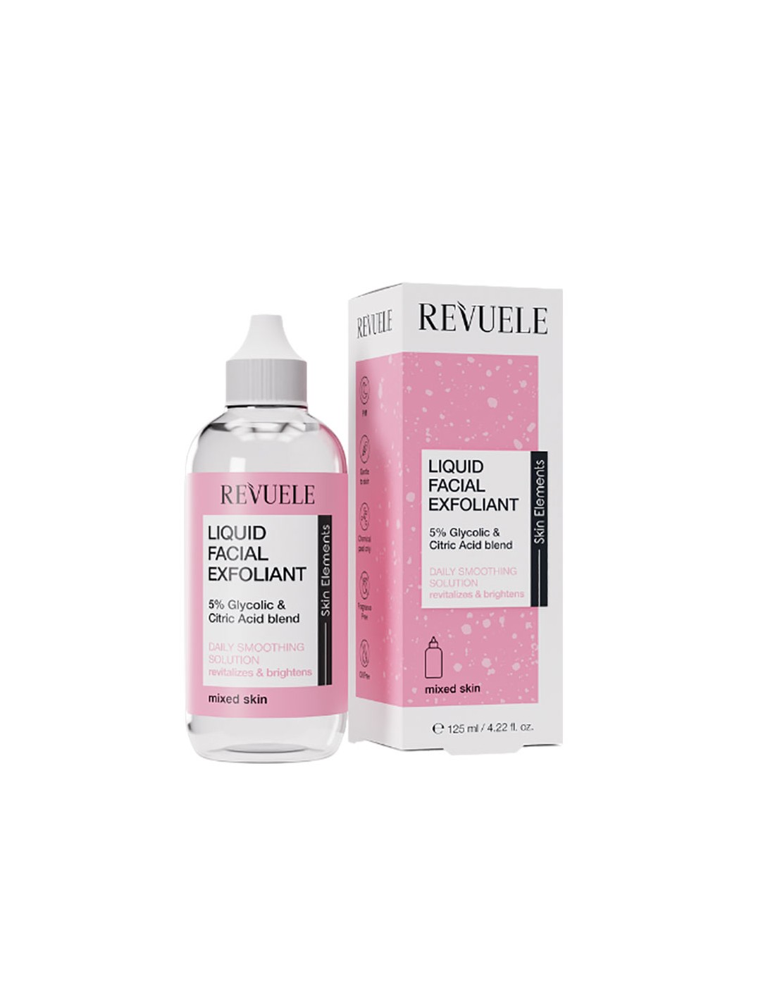 The Revuele Liquid Facial Exfoliant 5% Glycolic + Acid Blend Mixed Skin is an exfoliant composed of a mix of fine peeling acids. This exfoliant promotes your skin's natural renewal process by removing dead skin cells, resulting in a smooth, renewed and clear complexion.