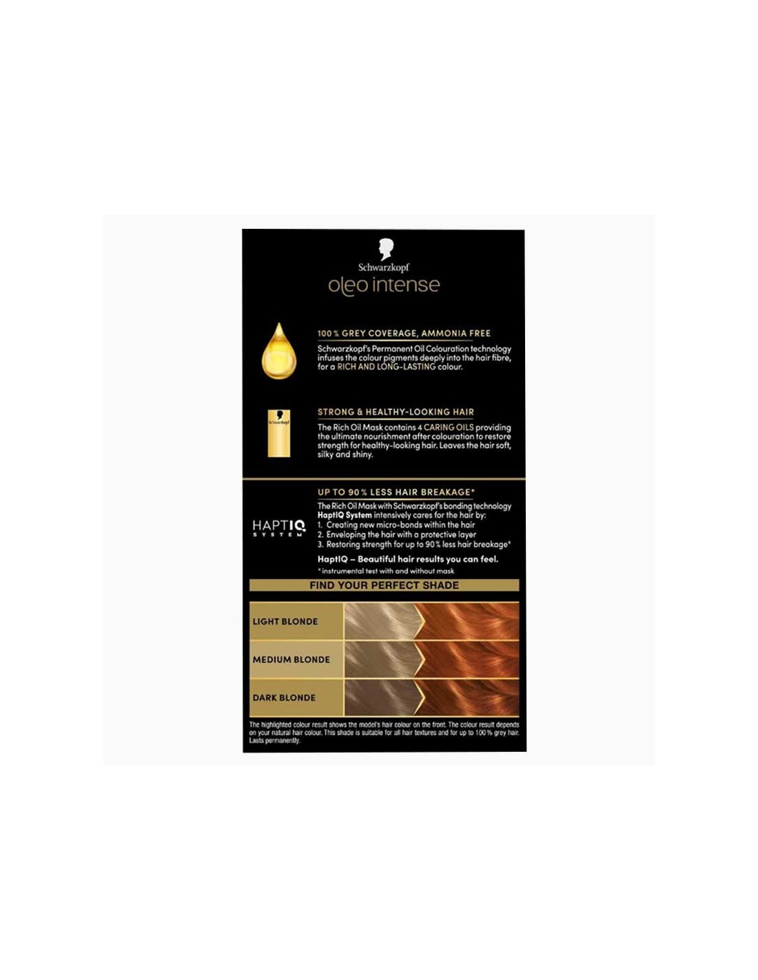 Schwarzkopf Oleo Intense Copper Red 7-77 No Ammonia is a permanent hair dye designed for light blonde to dark blonde hair. The caring oil formula gives rich, long-lasting colour with up to 100% grey coverage, whilst the fair trade argan oil in the conditioner leaves your hair strong, soft and full of shine.