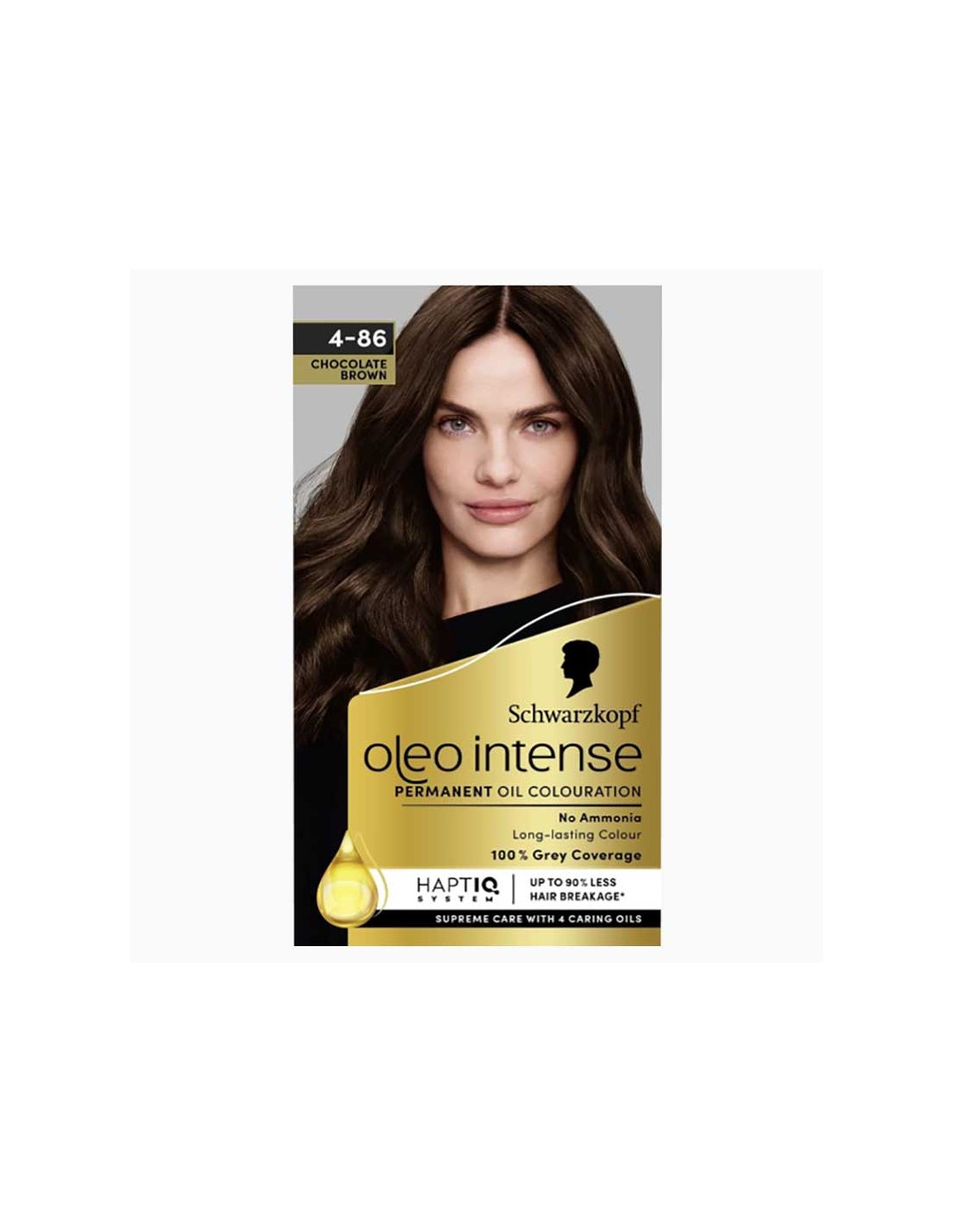 Schwarzkopf Oleo Intense Chocolate Brown 4-86 No Ammonia is a permanent hair dye designed for medium blonde to medium brown hair. The caring oil formula gives rich, long-lasting colour with up to 100% grey coverage, whilst the fair trade argan oil in the conditioner leaves your hair strong, soft and full of shine.