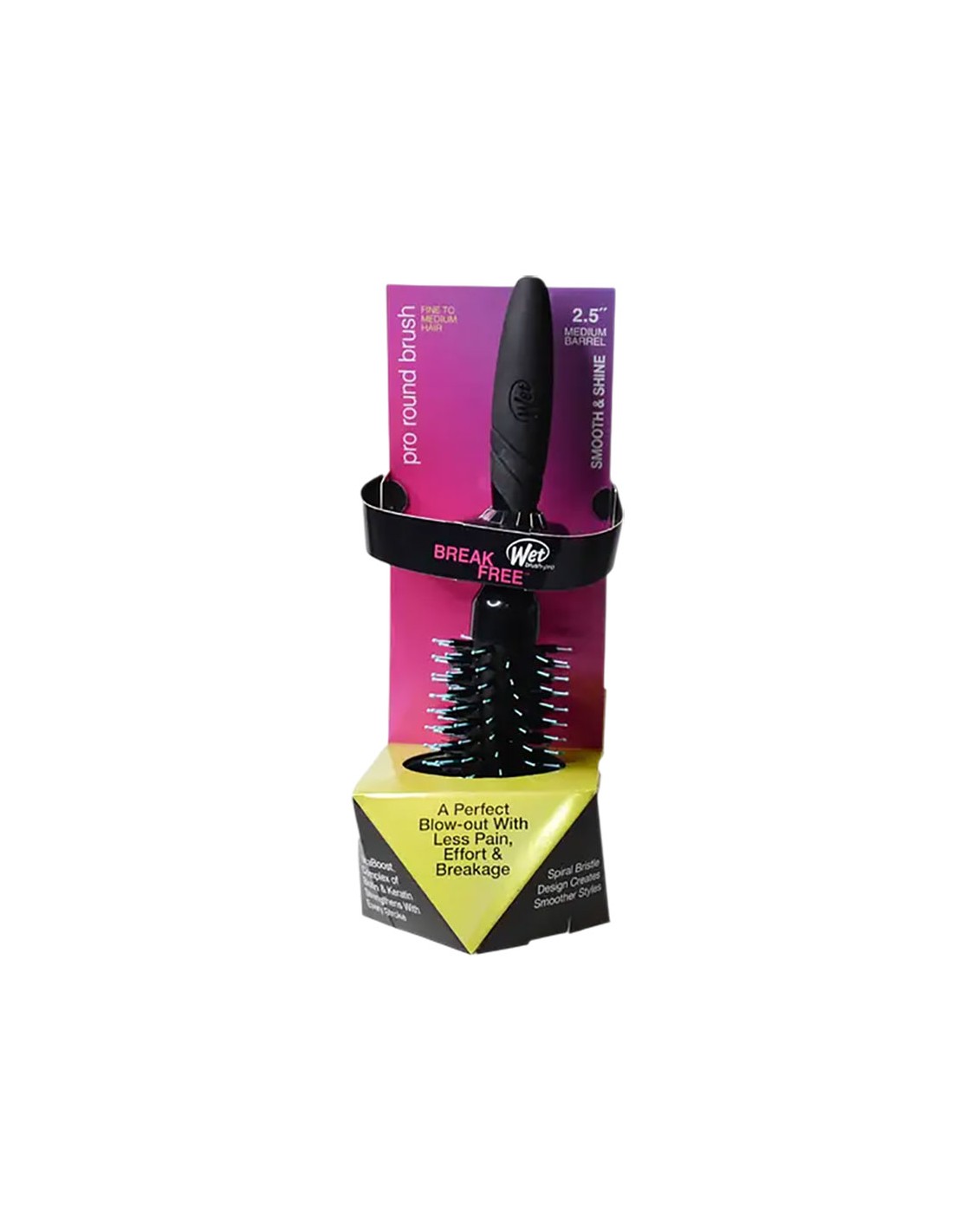 Wet Brush Pro Smooth And Shine Round Brush For Fine To Medium Hair is a professional, shine boosting styling brush. Exclusive HeatFlex™ bristles bend & flex to effortlessly detangle & remove knots with less pain & breakage. Signature helix spiral bristles create the perfect amount of tension for easier styling & smoother results. Uses proprietary VitaBoost Complex of biotin & keratin to strengthen hair & reduce frizz. Ceramic barrel emits negative ions for shiny, frizz-free styles. Ergonomic, rubberized EasyGrip™ gives more comfort & control, even when hands are wet.