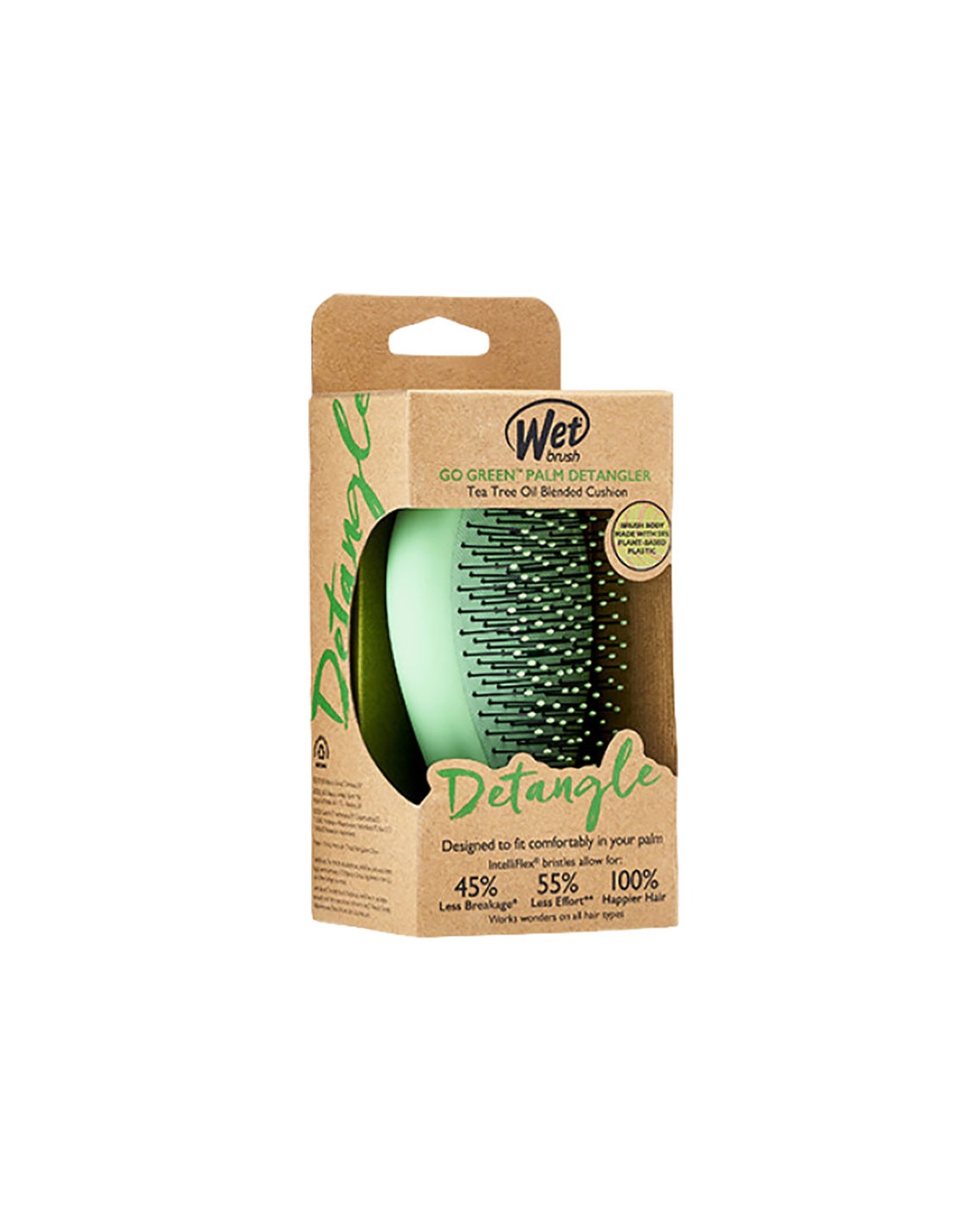 Wet Brush Go Green Tea Tree Oil Blended Cushion Palm Detangler combines effortless detangling with scalp-soothing benefits, all while promoting sustainability. This compact and eco-friendly brush is infused with tea tree oil, offering a refreshing and nourishing haircare experience.Unique shape was designed to fit comfortably in your palm - happier hair in the palm of your hands. The WetBrush Palm Detangler is designed to work through knots and tangles with comfort and control and its compact size makes it great for brushing on the go.